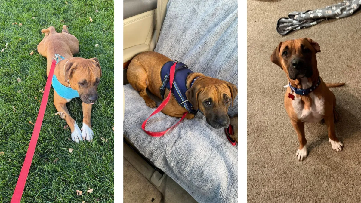 Leash walks with BG are a dream—he walks calmly without pulling, unless he spots a critter he’s curious about. Car rides are still a work in progress, but he’s made great strides and now hops in and out with just a little encouragement. He’s also fully crate-trained and impressively calm while crated, even with people or other dogs nearby. No barking, no whining—just quiet relaxation.