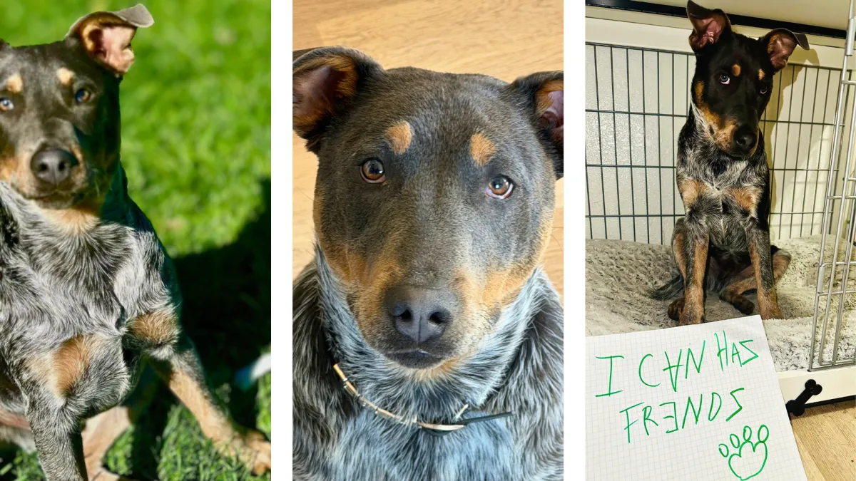 Guard dog? Not even close. If someone comes near, Onyx’s go-to move is flopping over for as many belly rubs as possible. True to his herding roots, he likes to make sure all his people (especially kids) are accounted for before settling down by the door.