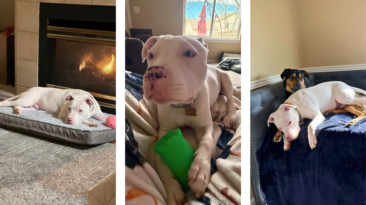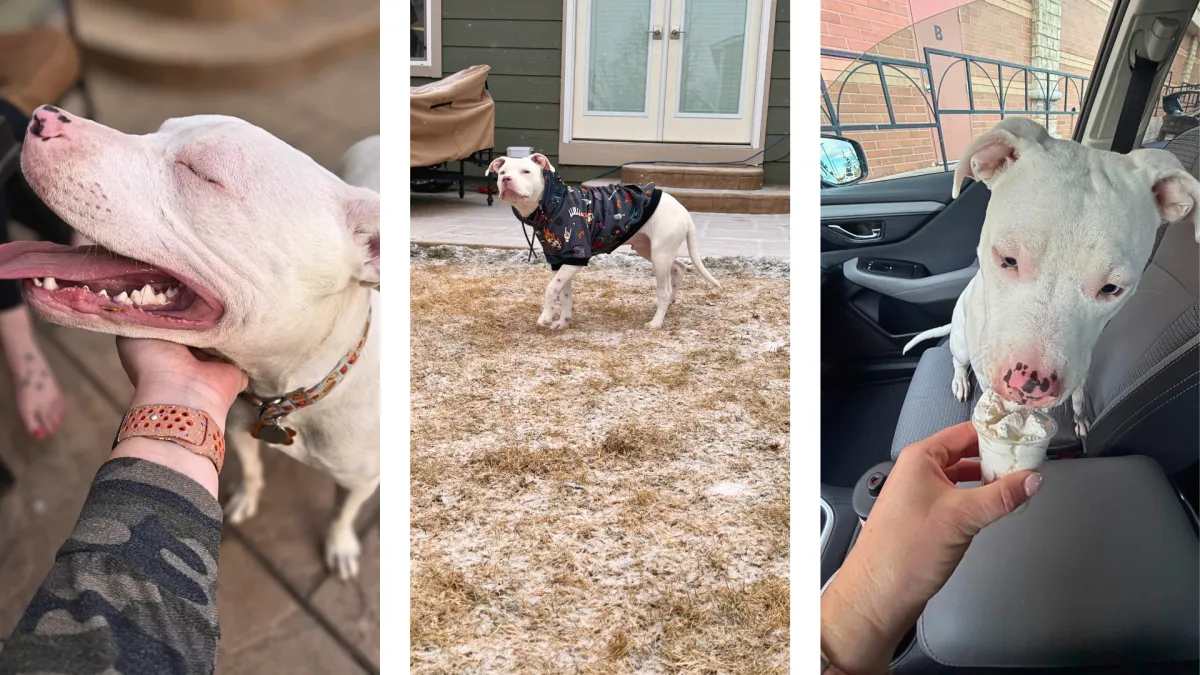 A deaf pup with the most striking blue eyes. He’s an absolute cuddle bug who loves being close to his people and soaking up all the affection he can get.