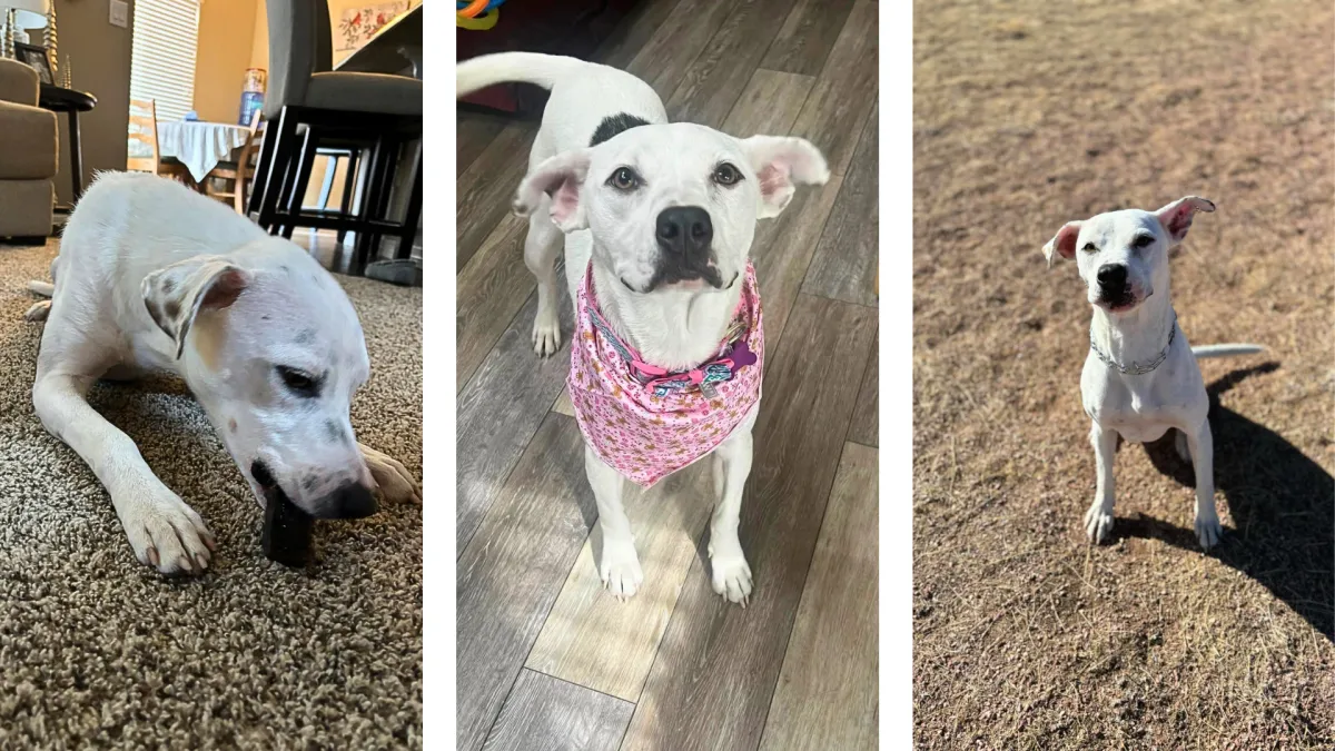 Skipper is a sweet, 1-year-old terrier mix who is still settling into her new home and learning to trust the world around her. Though she’s a little nervous at first, once she gets comfortable, she’s a playful and affectionate pup who loves to wag her tail and enjoys the company of other dogs. She’s particularly food-motivated, which makes training and bonding a breeze! Skipper prefers to eat in her kennel, away from other dogs, so you’ll often find her happily munching away in her quiet space. She’s also learning how to ask to go outside, though she’s had a few accidents in the house while figuring out the routine. With a little patience and understanding, Skipper is on her way to becoming a well-behaved and loving companion. Skipper is very interested in cats, but she means them no harm—she’s just curious and will chase after them if they run. If you catch her in the act and tell her “NO,” she listens well, though her curiosity can still be a bit of a problem when the cats need some peace. While Skipper can be shy around new people, she’s a fast learner and appreciates a calm approach. She’s a little unsure of her current human dad, but once he got down to her level and offered an open hand, she warmed up quickly. Skipper is more comfortable with other dogs and loves to play outside with them, but she’s still building confidence when it comes to people. She’s a sensitive soul who enjoys chin scratches but doesn’t like being petted from above. Sudden movements can startle her, so it’s best to approach her gently and give her the time she needs to feel safe. If you’re looking for a playful, sweet-natured dog who just needs a little time and space to build trust, Skipper might be the perfect match for you. She’s ready to join a family that will give her the patience and love she deserves while helping her grow into the confident, affectionate dog she’s meant to be!