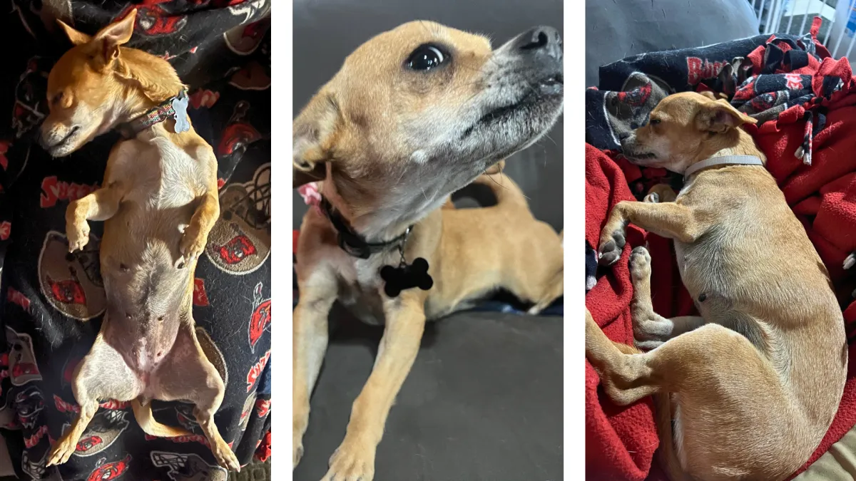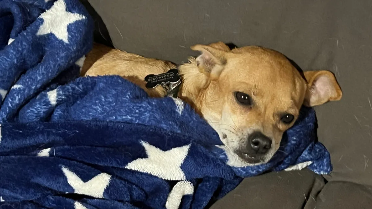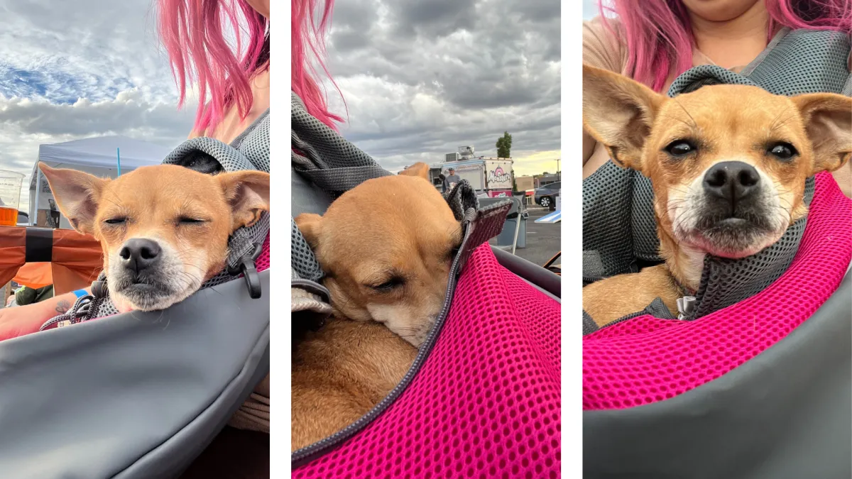 Most of the day, you'll find me curled up in a comfy spot, but I do get little bursts of energy where I'll jump around and wag my tail with excitement. I also love to play with the puppy in my foster home for about 15 minutes a day! Going for walks is another favorite—I’ve even joined my fur friends on 1-mile walks (but I really enjoy relaxing in my carrying bag too).
